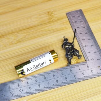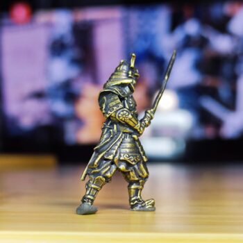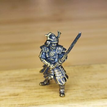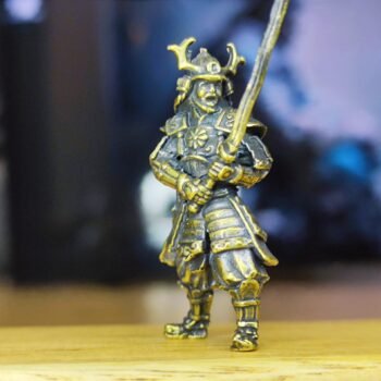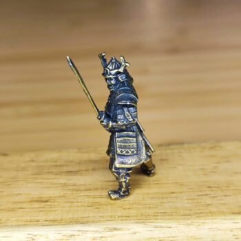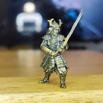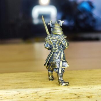 A miniature brass samurai figurine with a battle-ready stance, finely detailed armor, and a traditional samurai helmet with horns. This solid brass sculpture showcases expert craftsmanship, highlighting the textures and sharp angles that define classic warrior aesthetics. A perfect collectible for samurai history fans, martial arts enthusiasts, and display collectors, this unique ornament adds an elegant touch to any space.