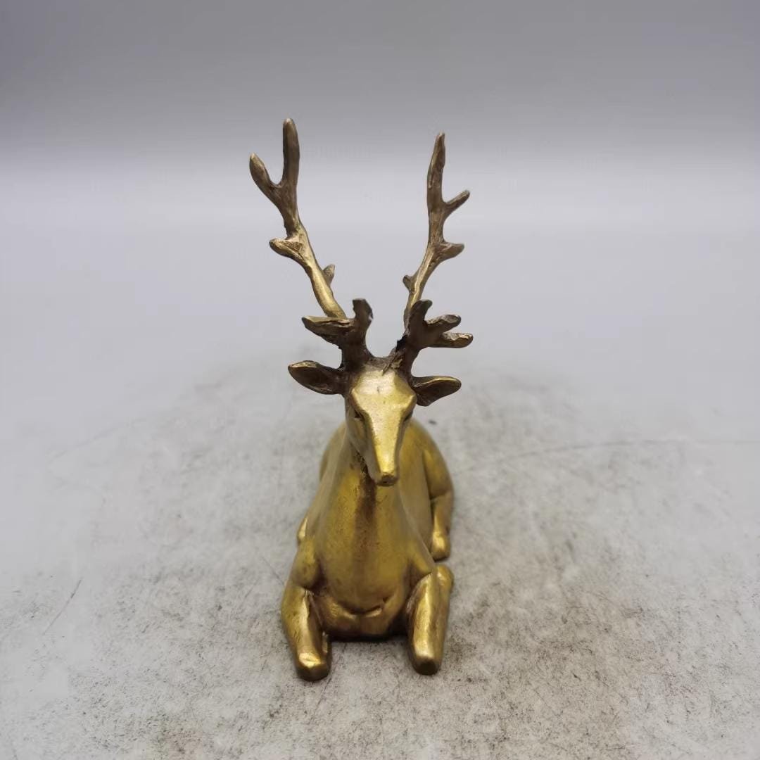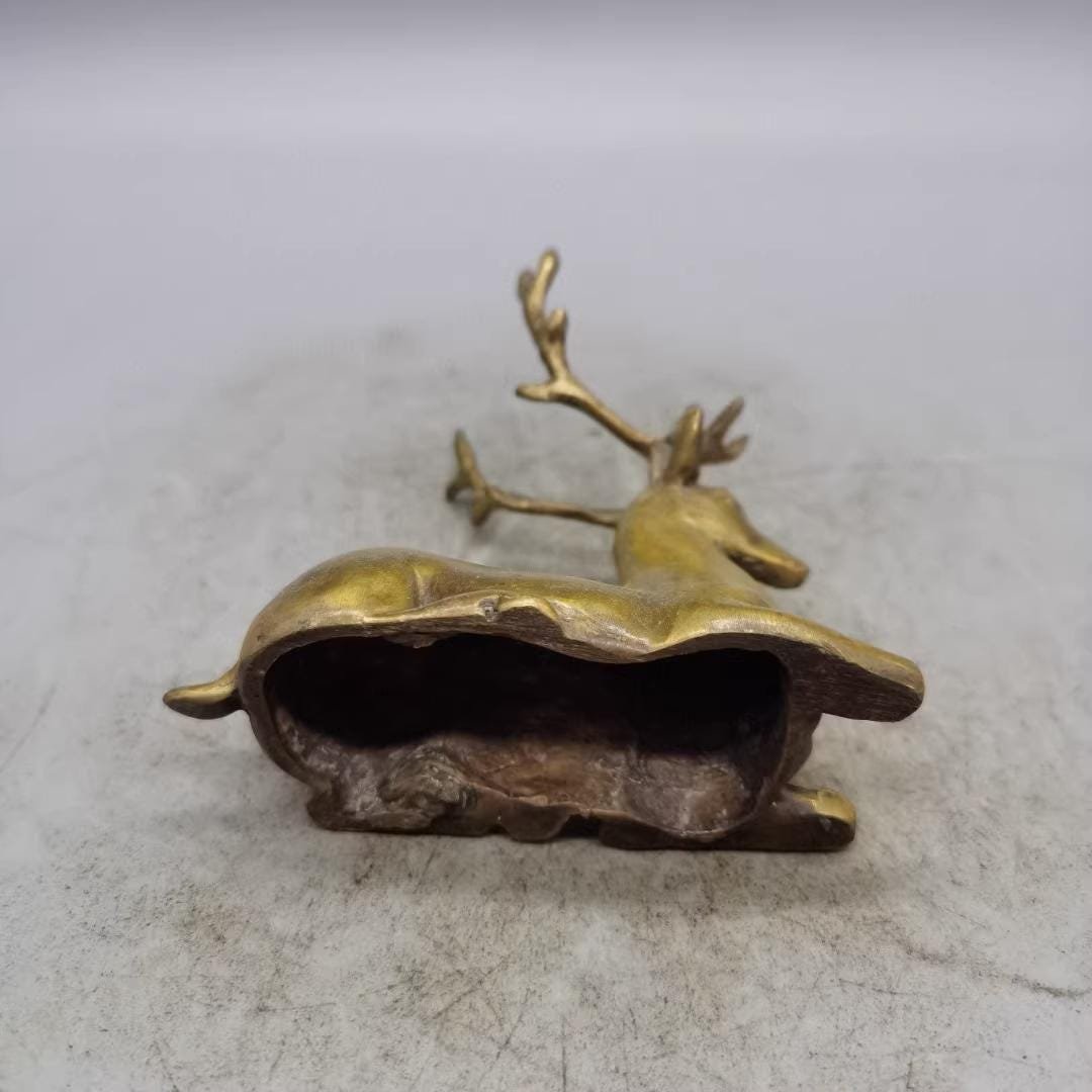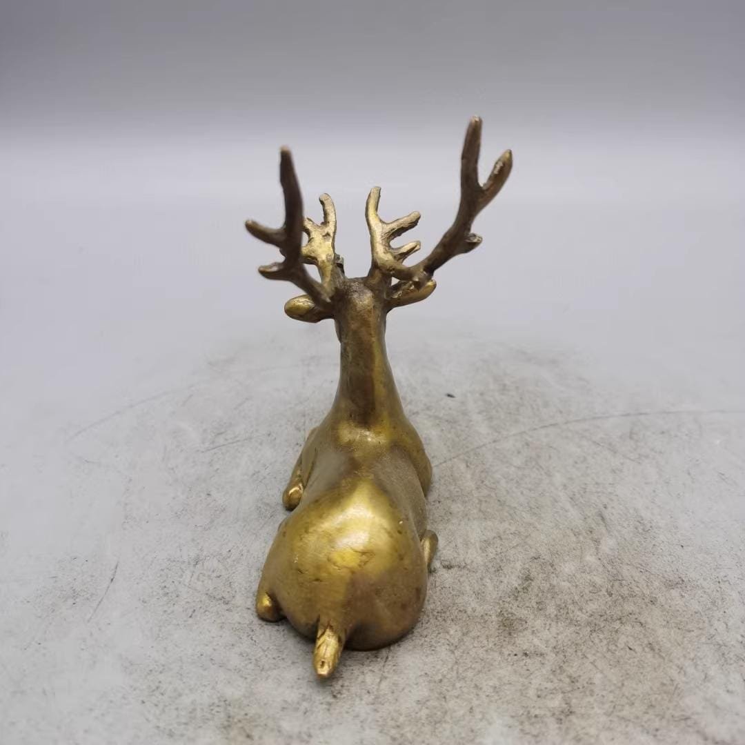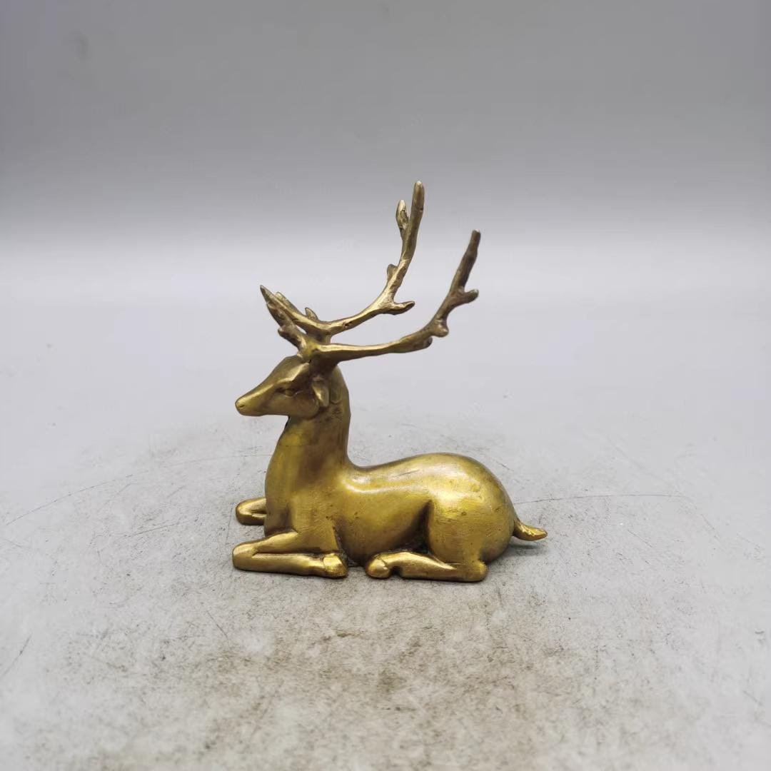This solid brass deer figurine captures a tranquil moment in nature, depicting a resting sika deer with finely sculpted antlers and sleek body contours. The smooth polished brass finish enhances its elegant aesthetic, making it a striking yet calming addition to bookshelves, work desks, or classic home decor arrangements.
